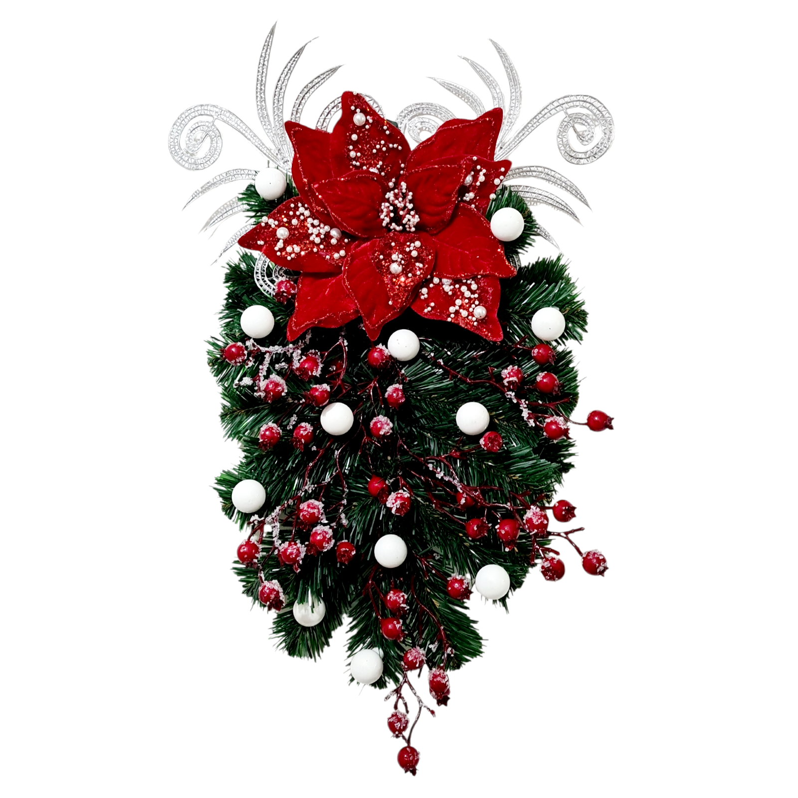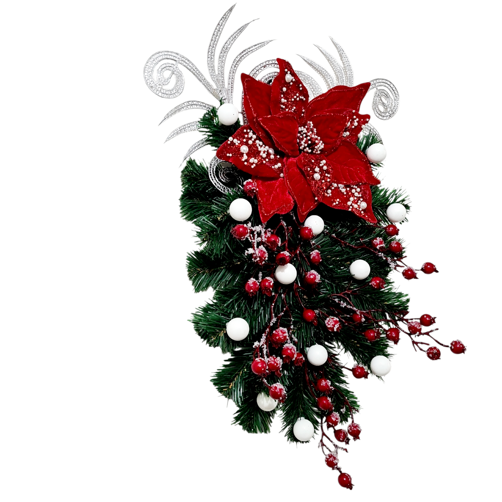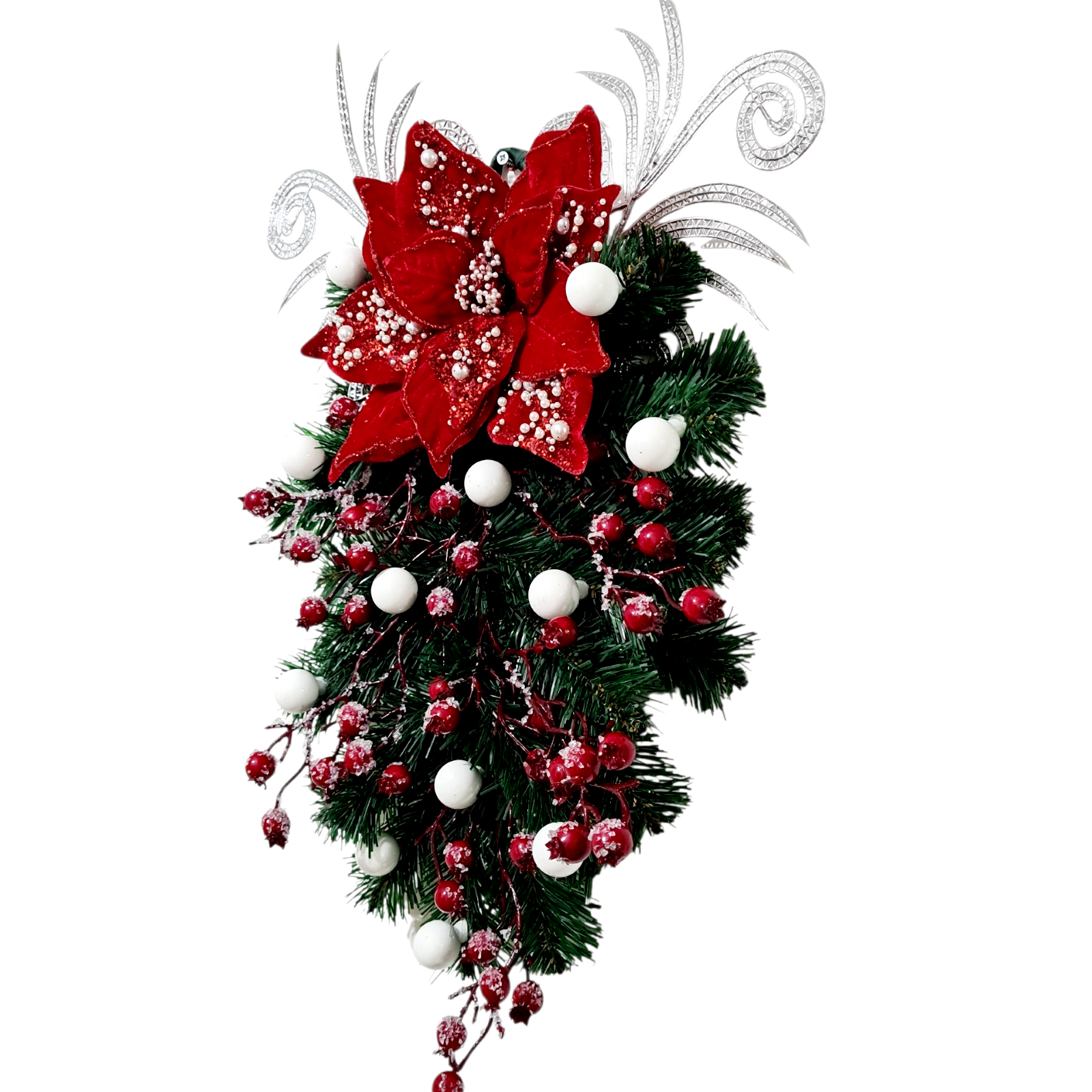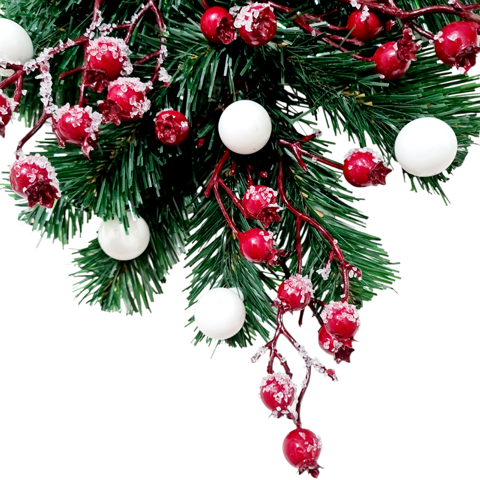Ghirlanda decorativa pentru Craciun, rosu, 55x30 cm, ornament deosebit utilizat pentru decor festiv in perioada sarbatorilor de iarna. Fabricat cu crenguta de brad artificial verde, crenguta cu merisoare rosii, globulete albe din sticla si craciunita rosie cu perlute.