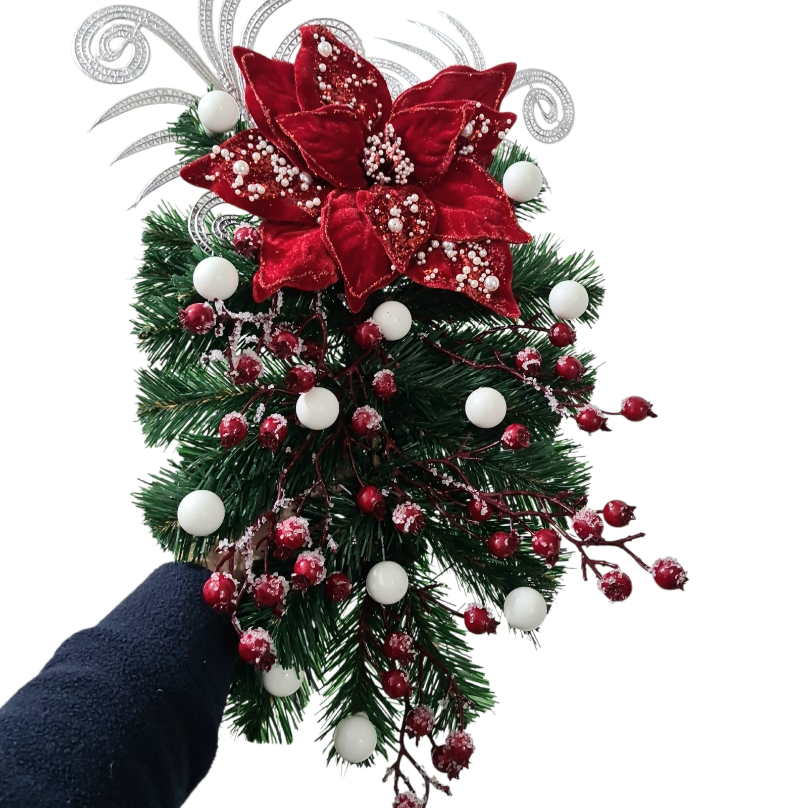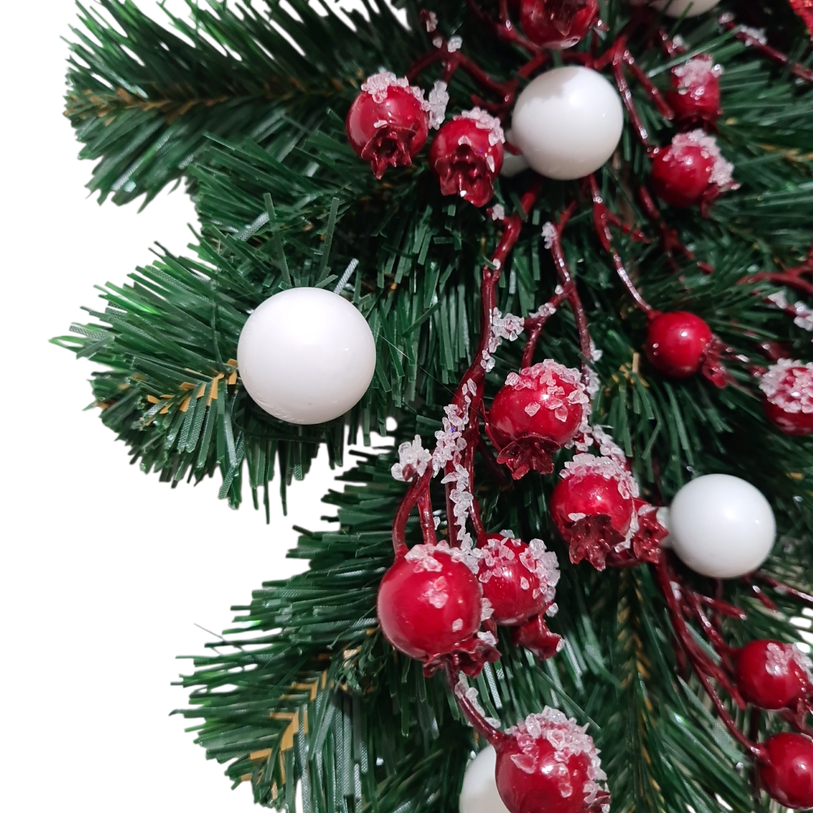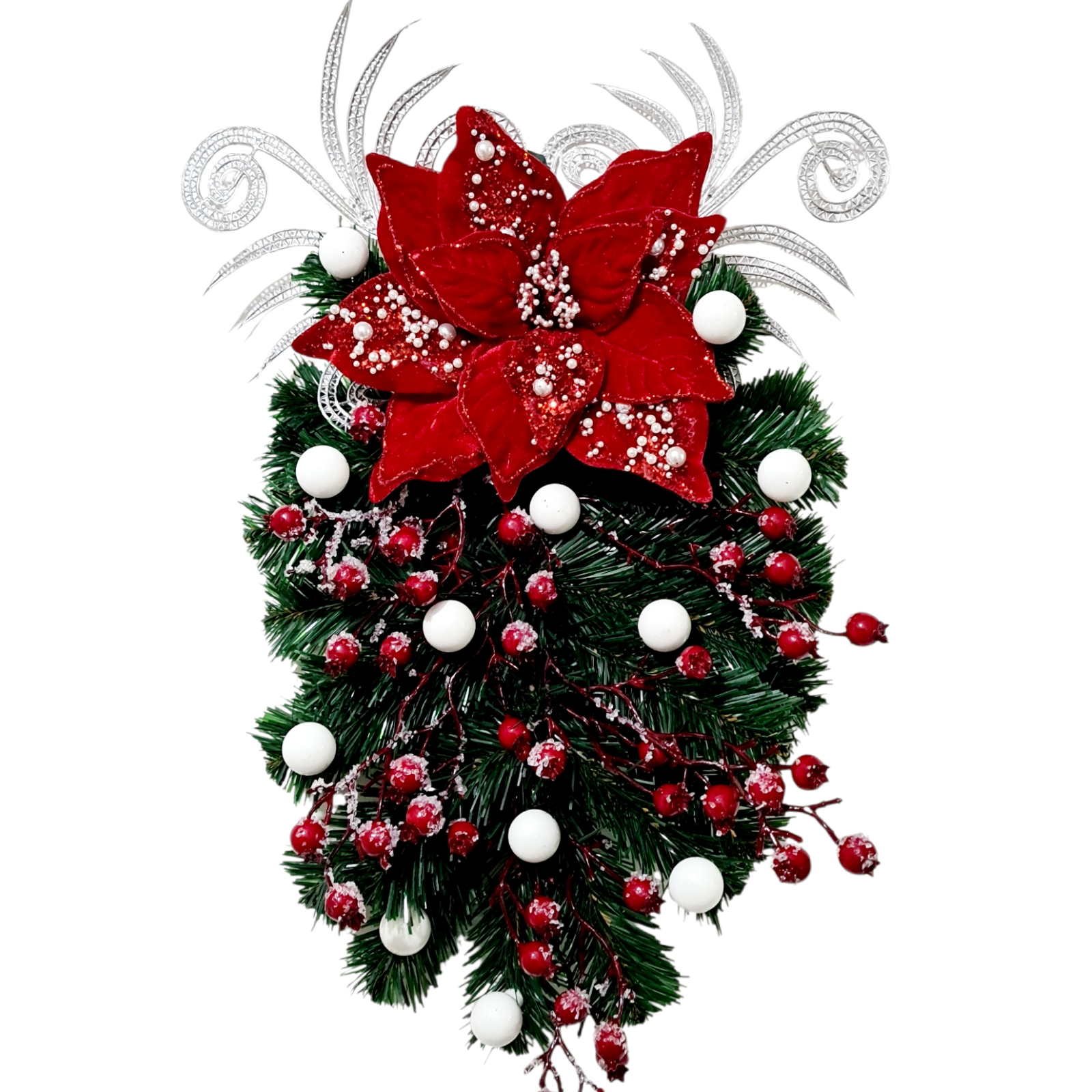 Ghirlanda decorativa pentru Craciun, rosu, 55x30 cm, ornament deosebit utilizat pentru decor festiv in perioada sarbatorilor de iarna. Fabricat cu crenguta de brad artificial verde, crenguta cu merisoare rosii, globulete albe din sticla si craciunita rosie cu perlute.