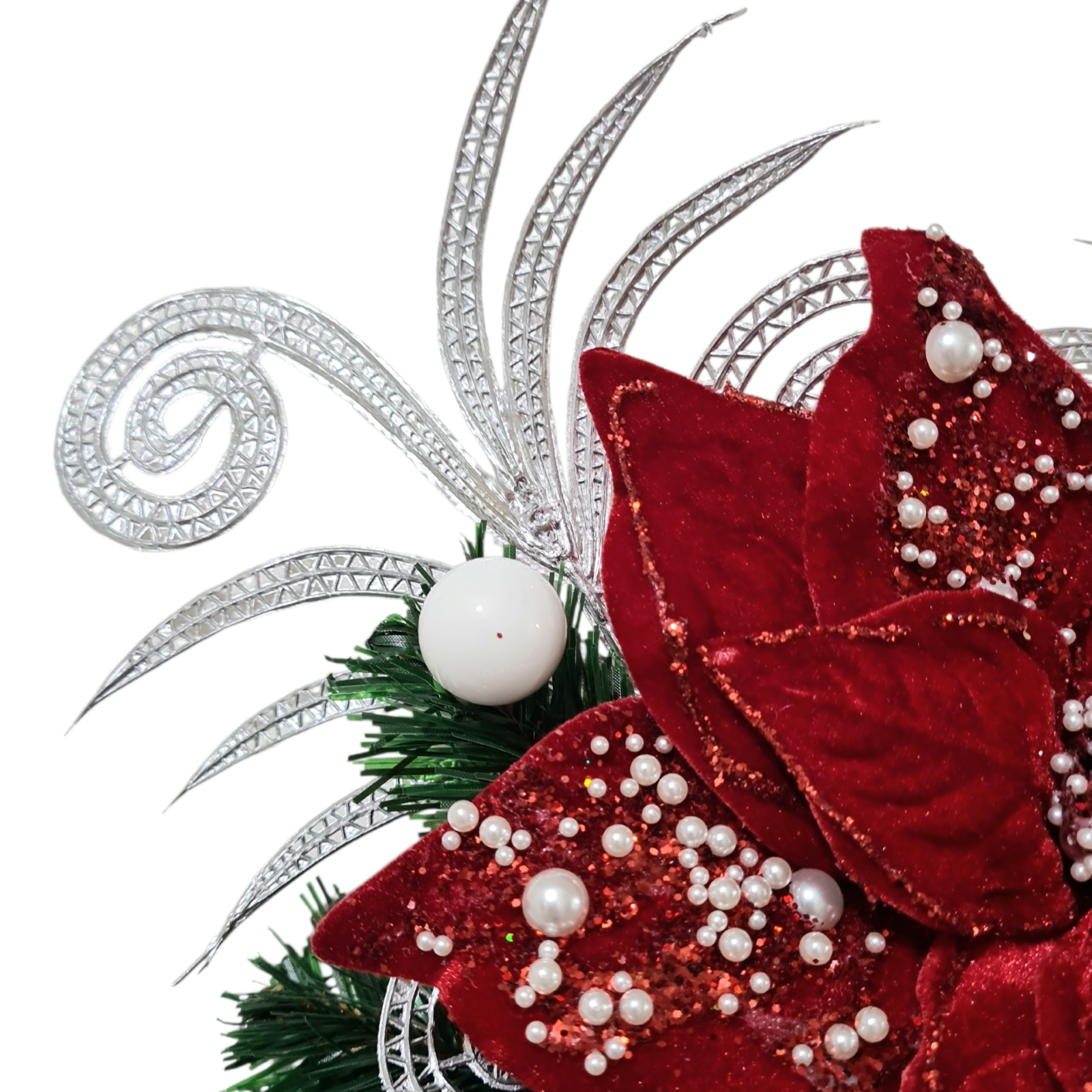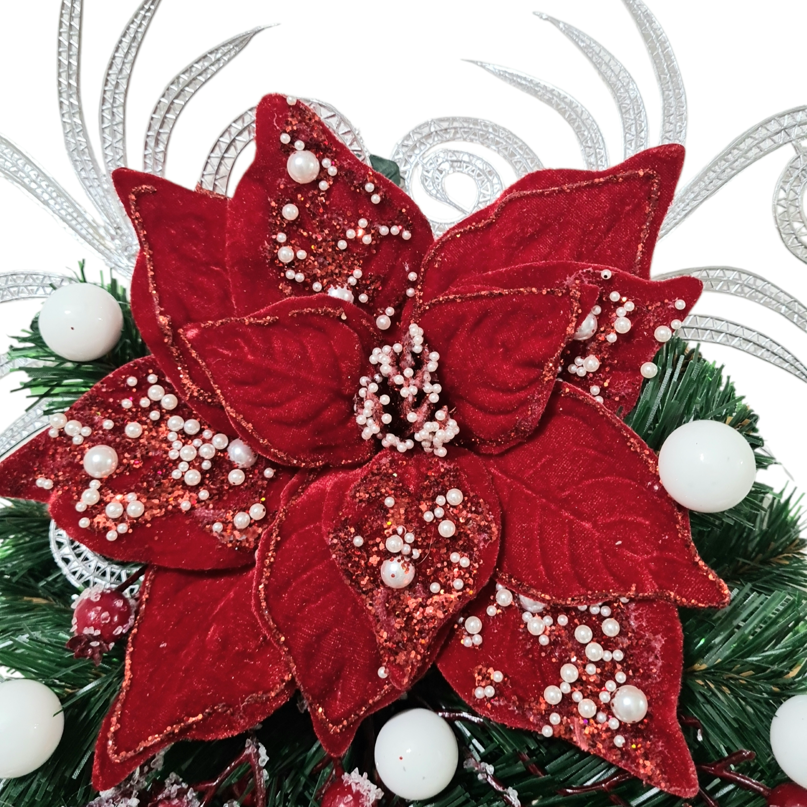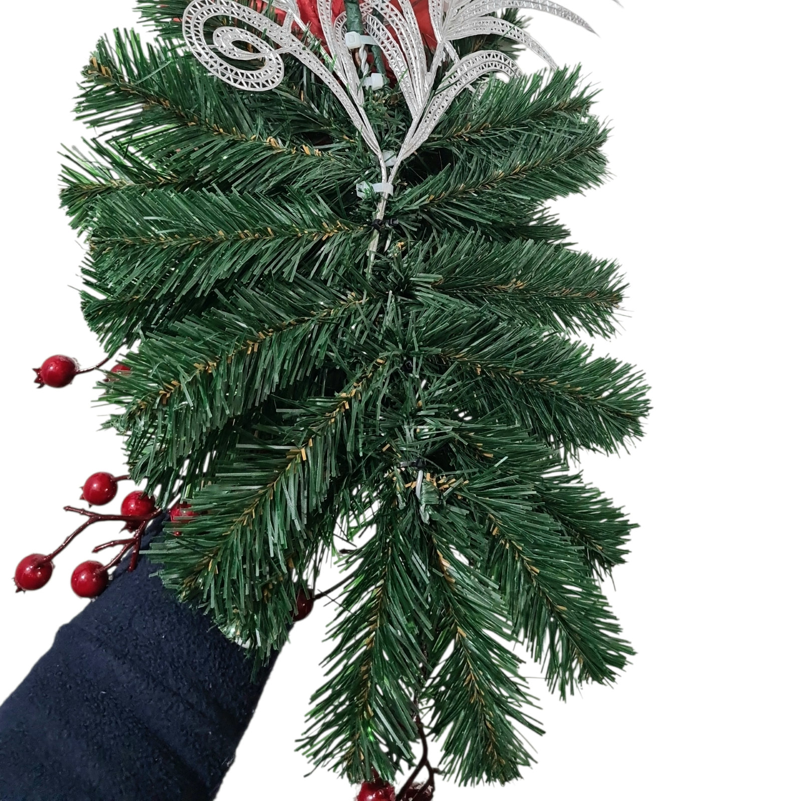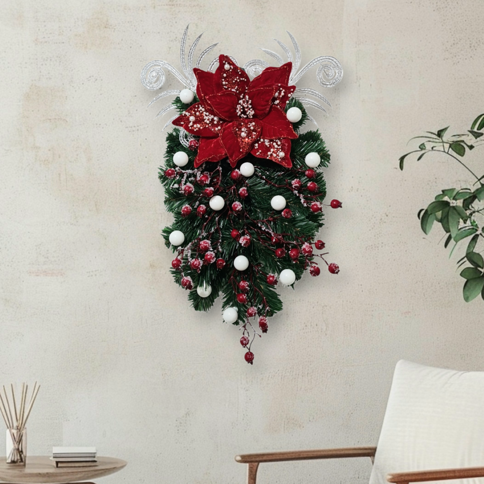 Ghirlanda decorativa pentru Craciun, rosu, 55x30 cm, ornament deosebit utilizat pentru decor festiv in perioada sarbatorilor de iarna. Fabricat cu crenguta de brad artificial verde, crenguta cu merisoare rosii, globulete albe din sticla si craciunita rosie cu perlute.