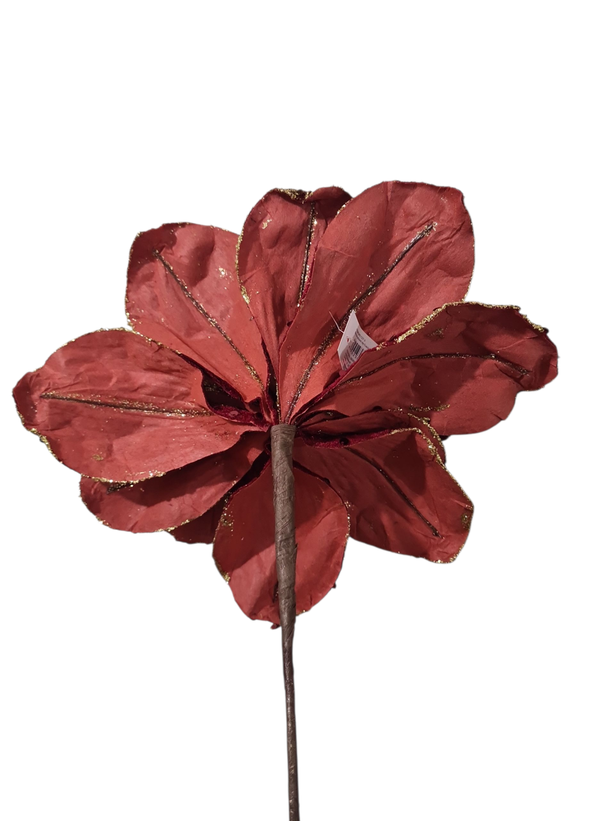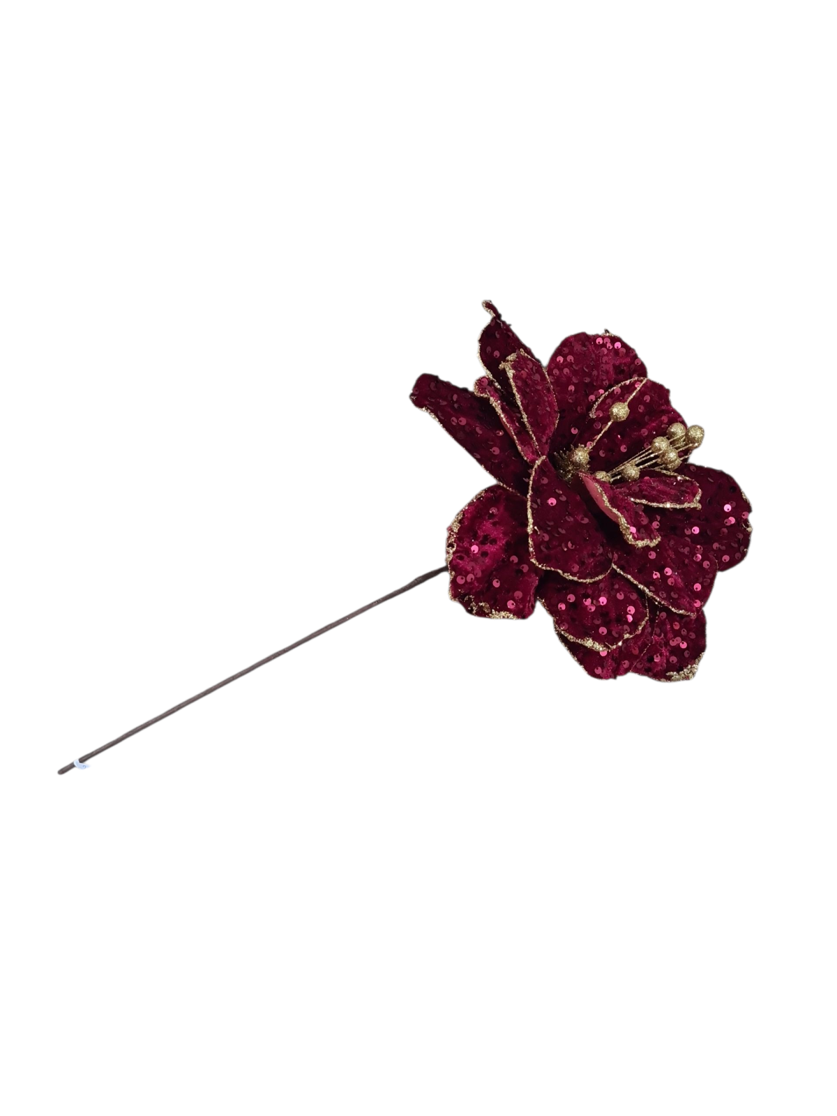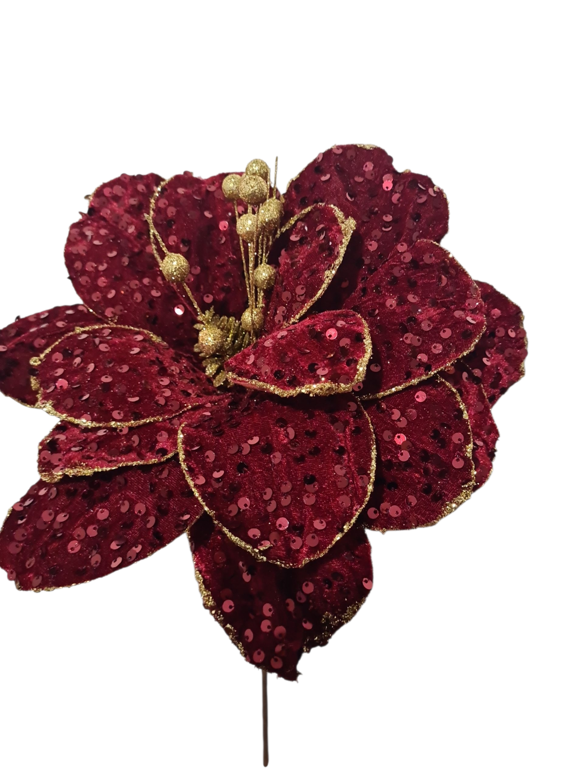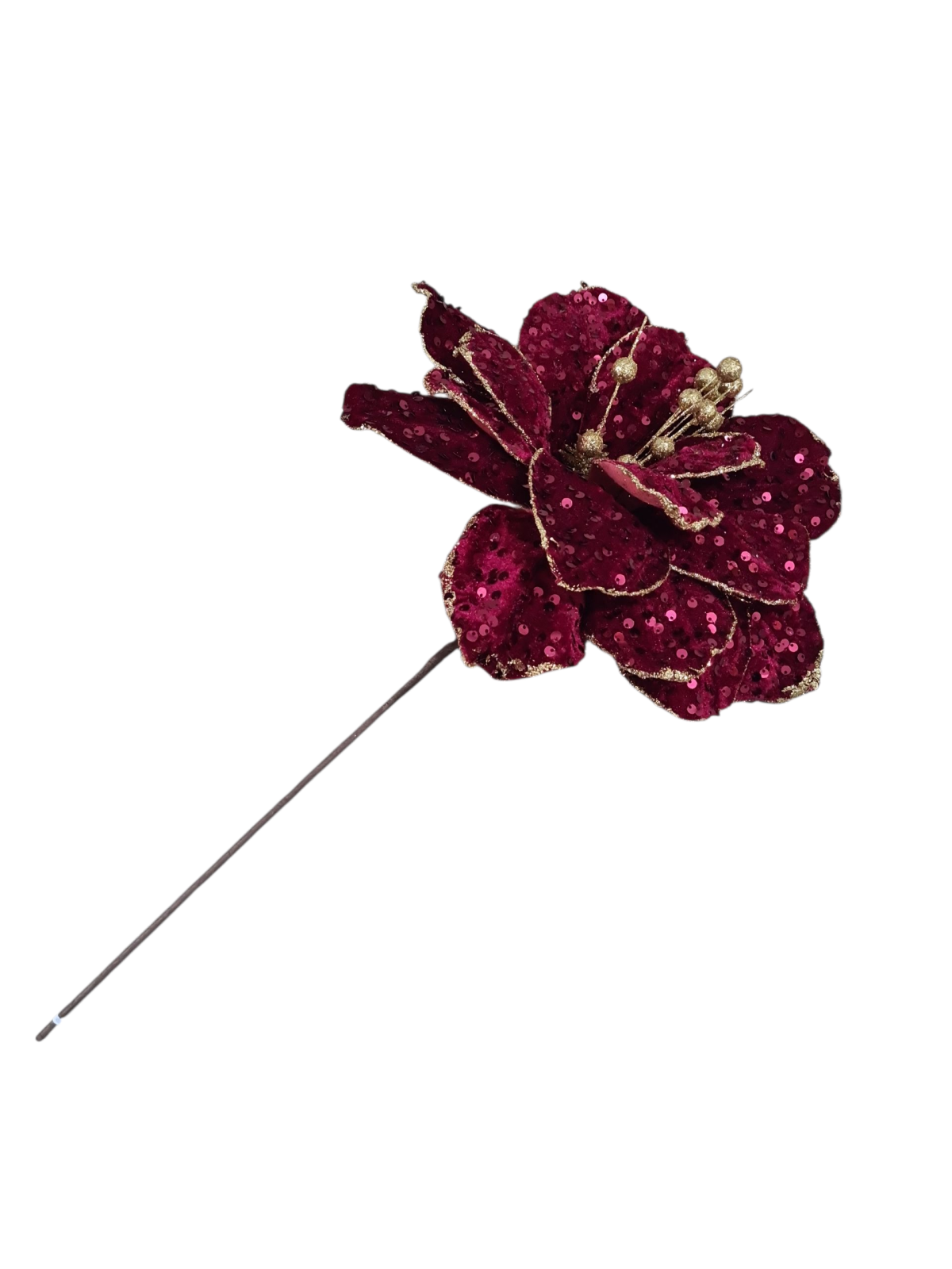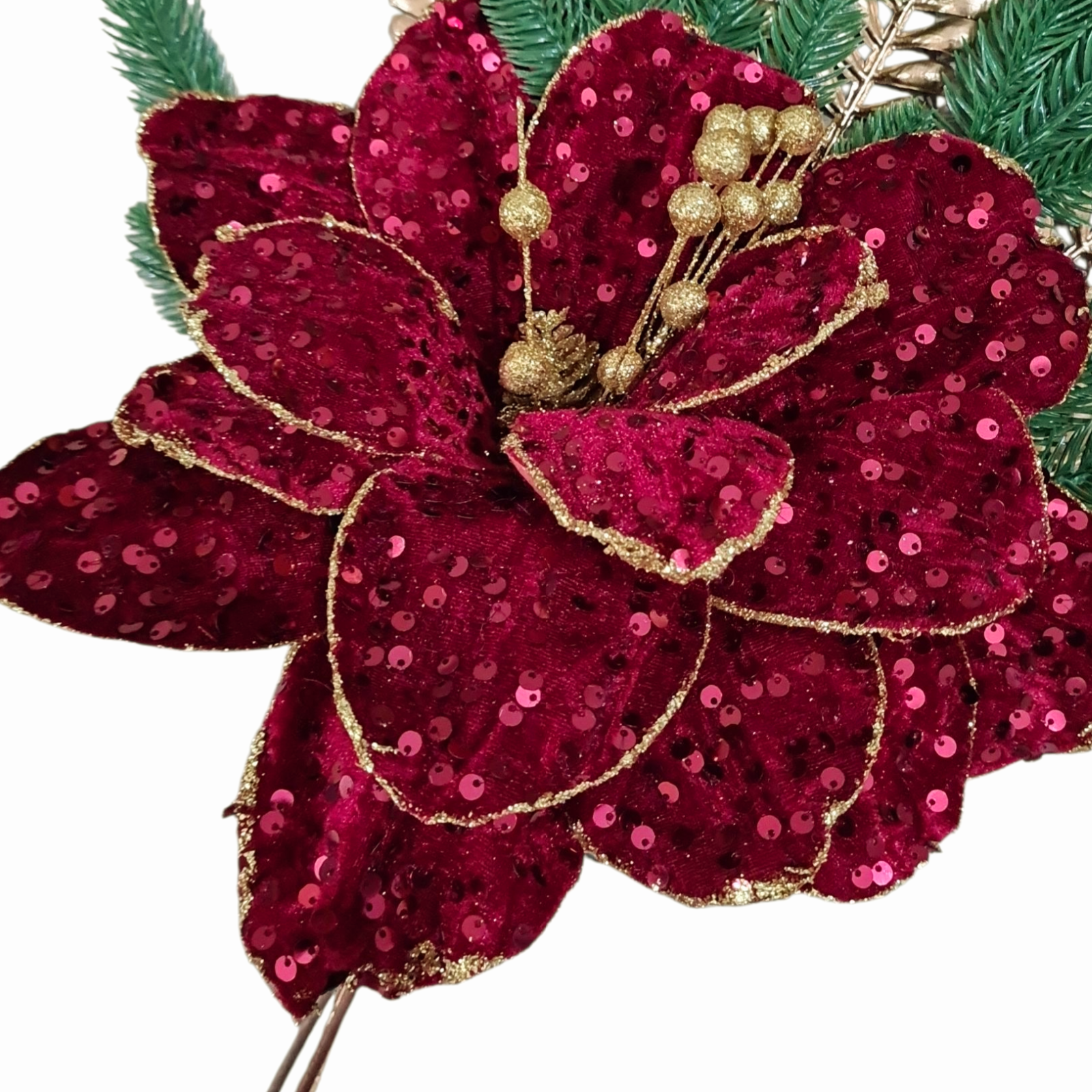 Craciunita decorativa deosebita cu diametrul florii de 30 cm, 15 petale si tija de 40 cm. Poate fi utilizata pentru decor de sarbatoare in perioada sarbatorilor de iarna. In functie de dispozitivul utilizat, nuanta poate fi perceputa diferit. culorile disponibile sunt Verde inchis si Bordo.