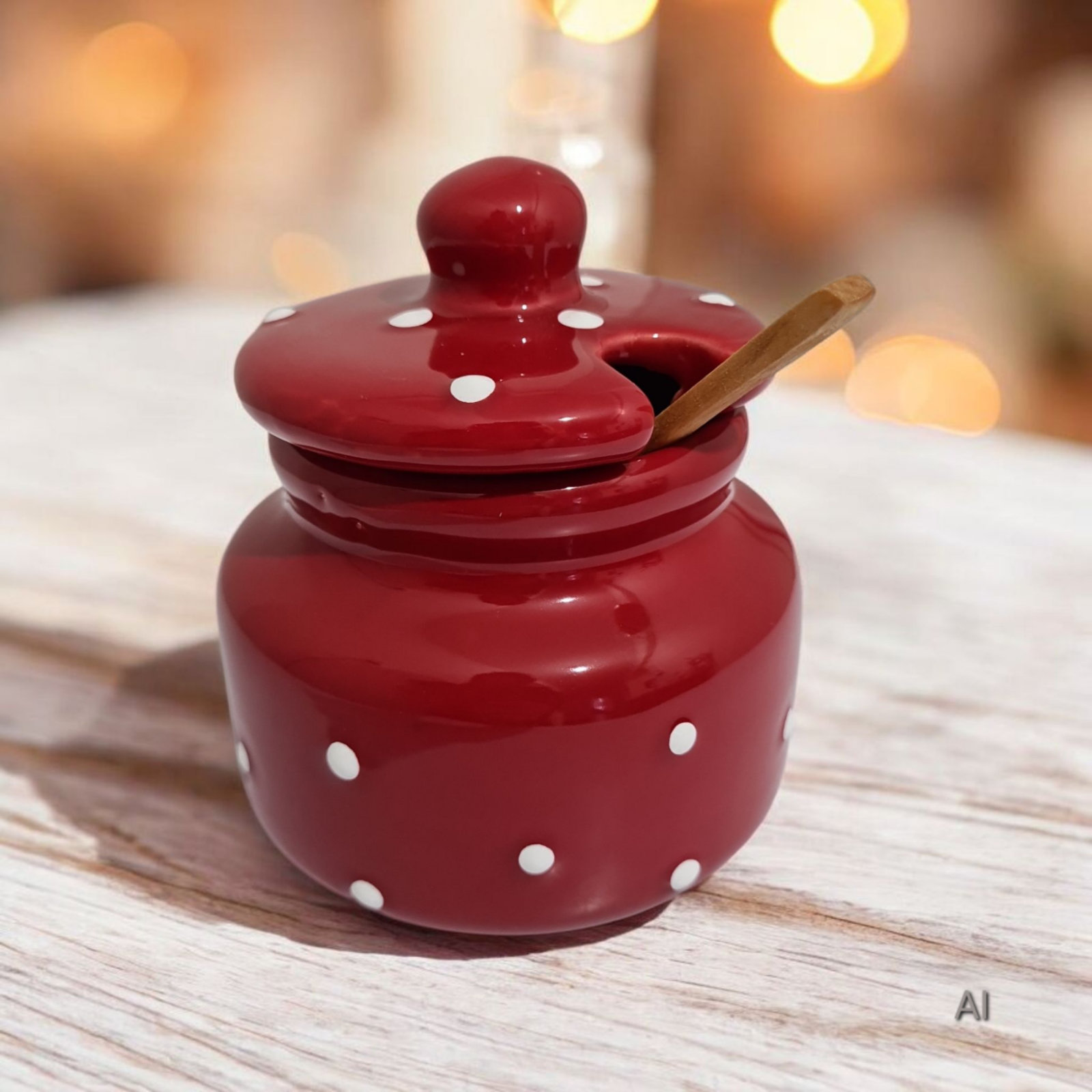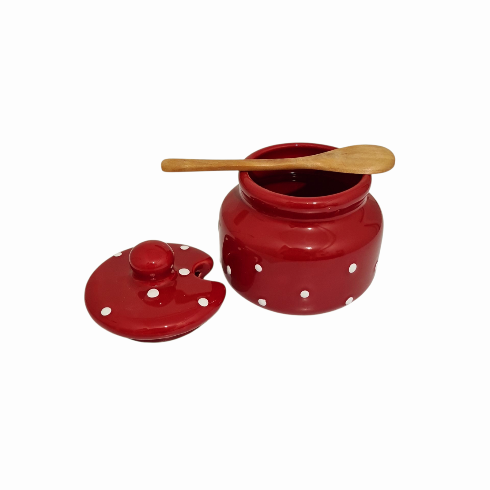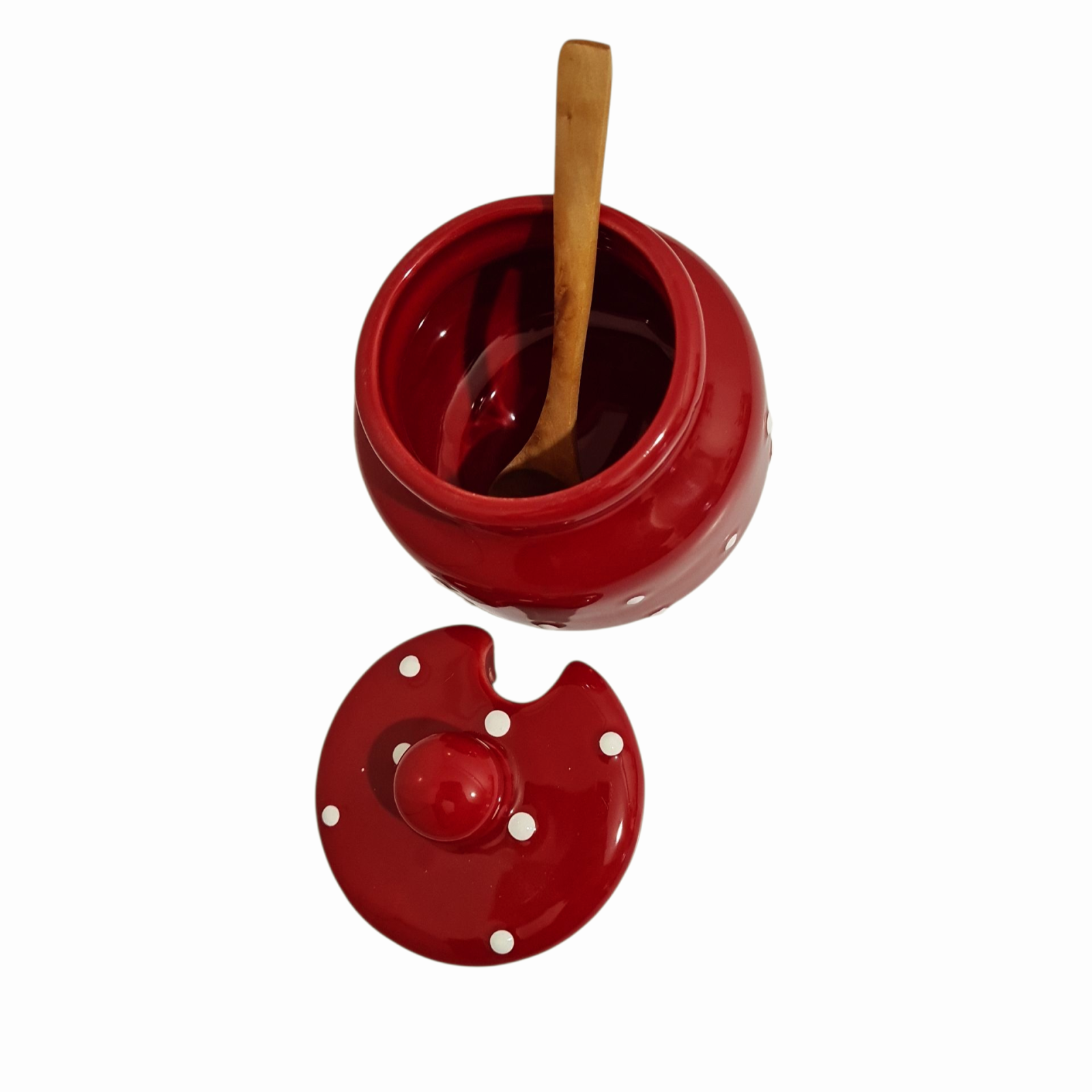 • Design: Prezinta un design rosu cu buline albe, are capac și include o lingurita de lemn pentru miere.